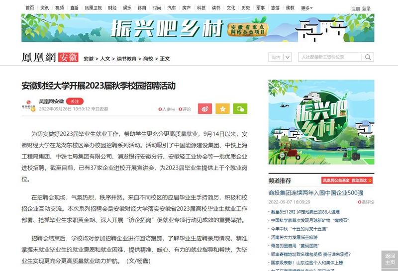 9月26日,凤凰网以《安徽财经大学开展2023届秋季校园招聘活动》为题,报道我校为切实做好2023届毕业生就业工作,帮助学生更充分更高质量就业,自9月14日以来在龙湖东校区举办校园招聘系列活动。
