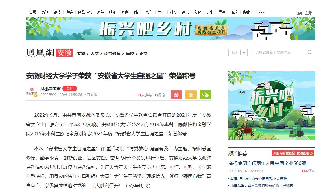 9月30日,凤凰网以《安徽财经大学学子荣获“安徽省大学生自强之星”荣誉称号》为题,报道我校经济学院2019级本科生陈献柱和金融学院2019级本科生欧阳童分别荣获2021年度“安徽省大学生自强之星”荣誉称号。