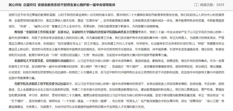 10月24日,安徽教育网以《安徽省教育系统干部师生衷心拥护新一届中央领导集体众望所归民心所向》为题,报道我校干部师生衷心拥护新一届中央领导集体。