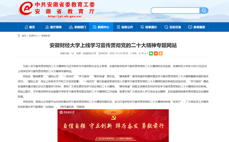 10月25日,安徽教育网、凤凰网以《安徽财经大学上线学习宣传贯彻党的二十大精神专题网站》为题,报道我校学习宣传贯彻党的二十大精神专题网站正式上线。