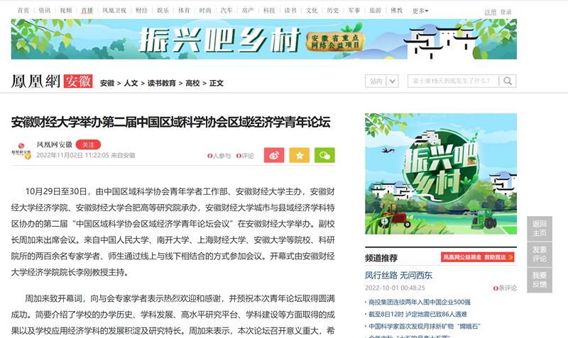 11月4日,凤凰网以《安徽财经大学举办第二次人口转型与社会保障制度创新国际学术研讨会》为题,报道第二届“中国区域科学协会区域经济学青年论坛会议”在我校举办。