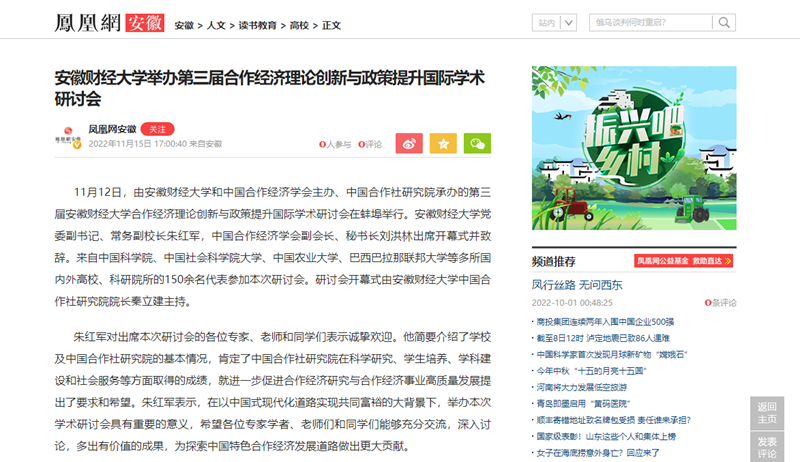 11月15日,凤凰网以《安徽财经大学举办第三届合作经济理论创新与政策提升国际学术研讨会》为题,报道三届合作经济理论创新与政策提升国际学术研讨会在我校举办。