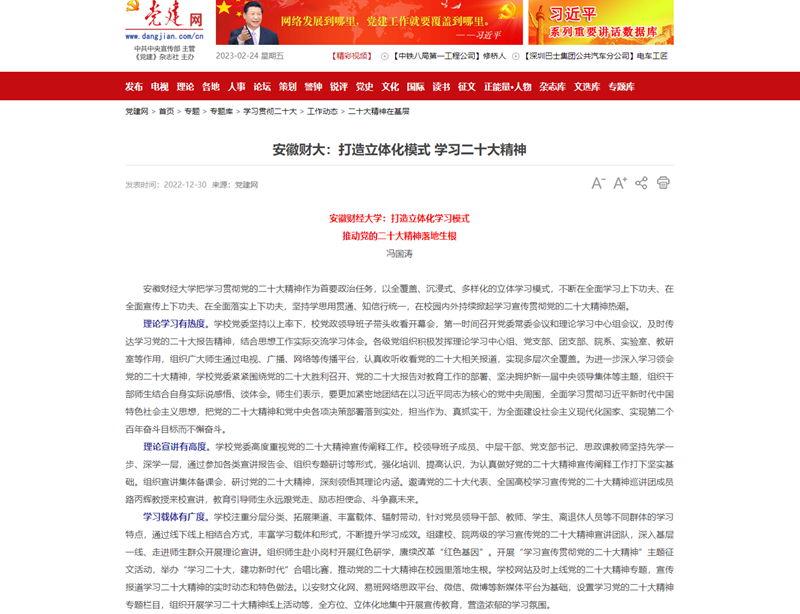 近日,党建网以《安徽财大:打造立体化模式 学习二十大精神》为题,报道我校以全覆盖、沉浸式、多样化的立体学习模式,在校园内外持续掀起学习宣传贯彻党的二十大精神热潮。