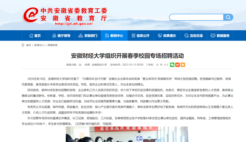近日,安徽教育网、凤凰网以《安徽财经大学组织开展春季校园专场招聘活动》为题,报道我校积极组织开展春季校园专场招聘活动。
