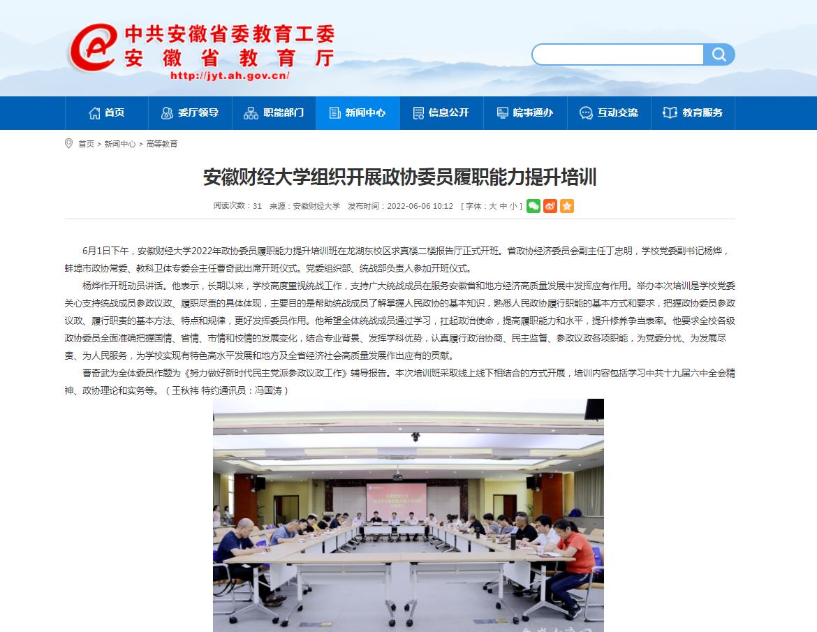 6月6日,安徽教育网以《安徽财经大学组织开展政协委员履职能力提升培训》为题,报道我校组织开展政协委员履职能力提升培训。